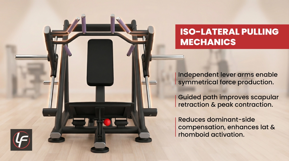 The independent lever arms facilitate symmetrical force production. Each arm moves through a guided path that improves scapular retraction and peak contraction. This reduces dominant-side compensation and enhances lat and rhomboid activation.