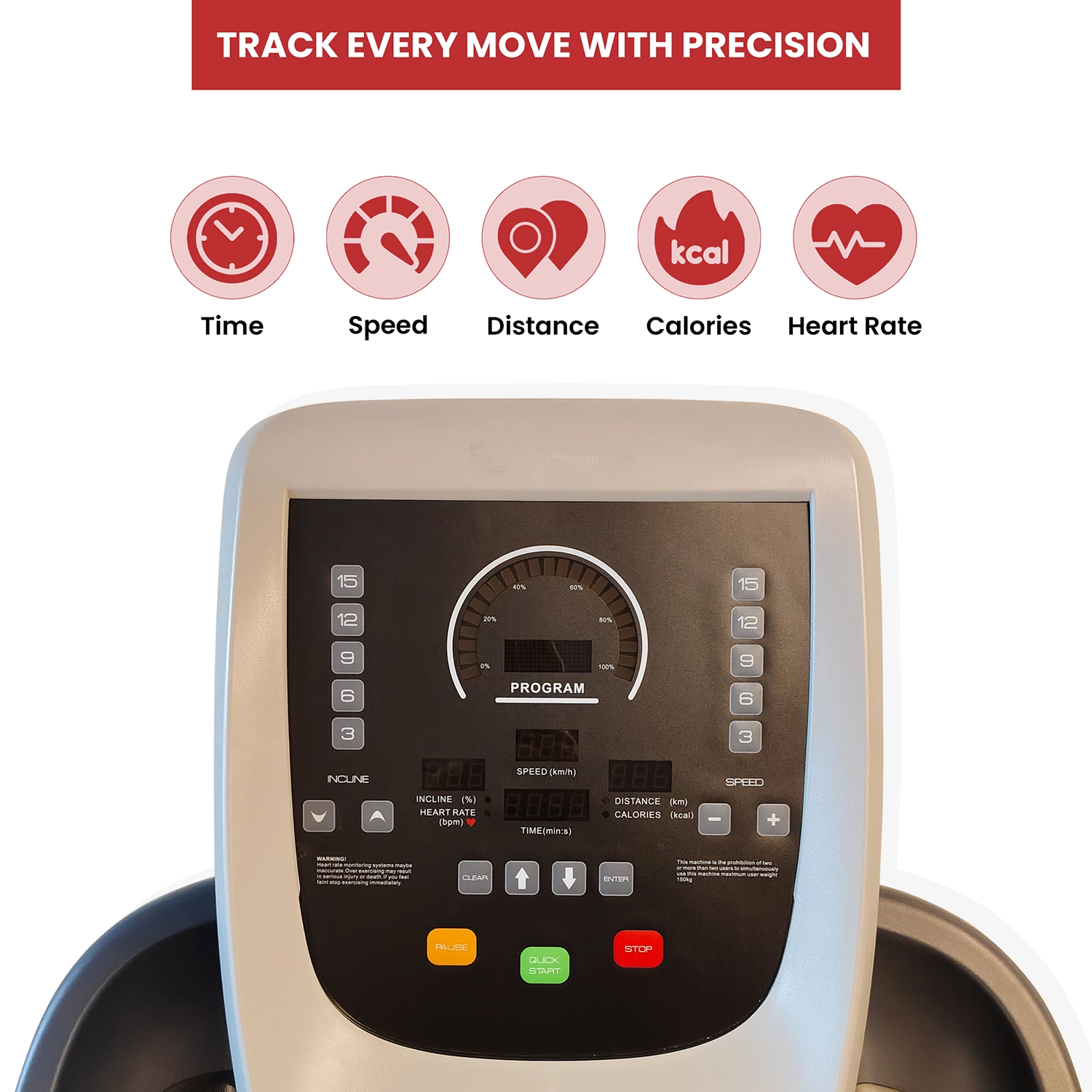 Engineered for elite performance. This heavy-duty treadmill boasts a powerful 7 HP AC motor, an industry-leading 220 kg weight capacity, and 15 levels of auto incline to conquer any workout.
